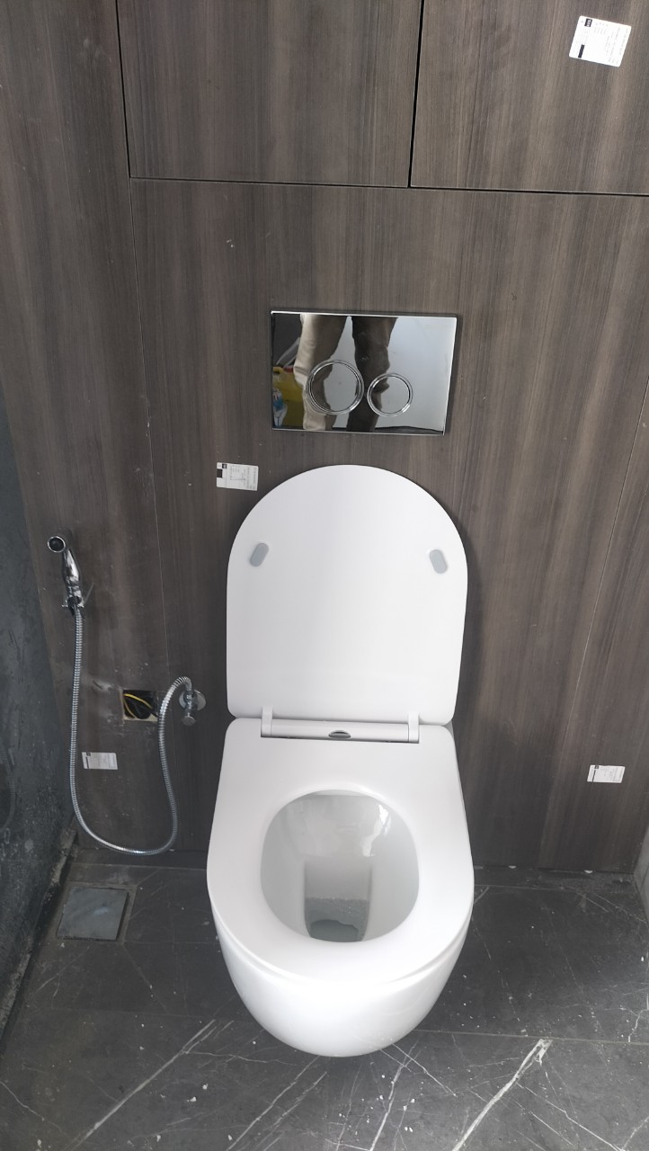 Bồn cầu két nước âm tường là thiết bị vệ sinh được anh Tuấn Anh lựa chọn với thiết kế theo phong cách hiện đại, mới mẻ với hệ thống treo tường độc đáo. Khách hàng sẽ được trải nghiệm những cảm giác thú vị, tuyệt vời bởi phần két nước nằm sâu bên trong góc tường, chỉ lộ ra phần thân cầu cùng nút xả. Thay vì đặt chân xuống đất thì gia chủ có thể tận hưởng khoảnh khắc vệ sinh trên không đầy kịch tính. Vừa hiện đại vừa tiết kiệm diện tích không gian một cách đáng kể.
