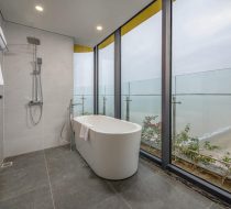 Bên cạnh đó, sử dụng cửa kéo bằng kính để ngăn cách 2 khu vực cũng là một giải pháp giàu tính thẩm mỹ cho nhà tắm.