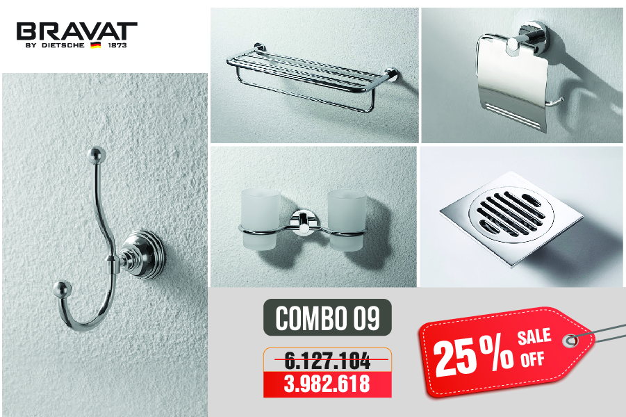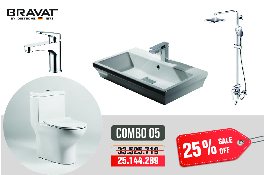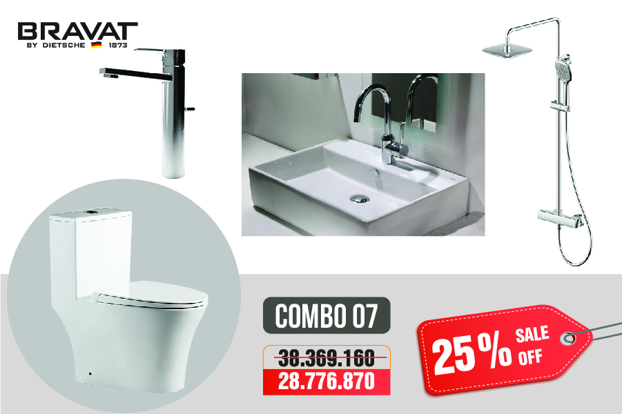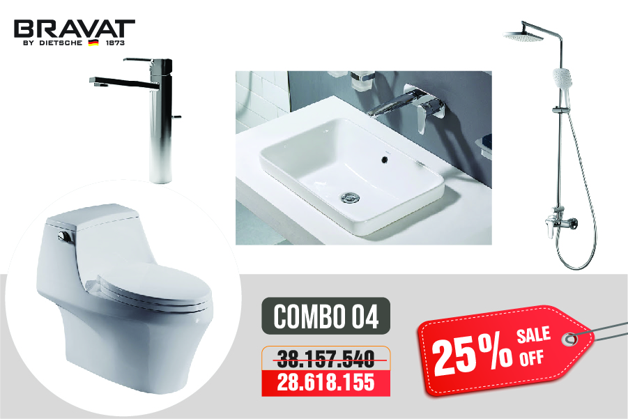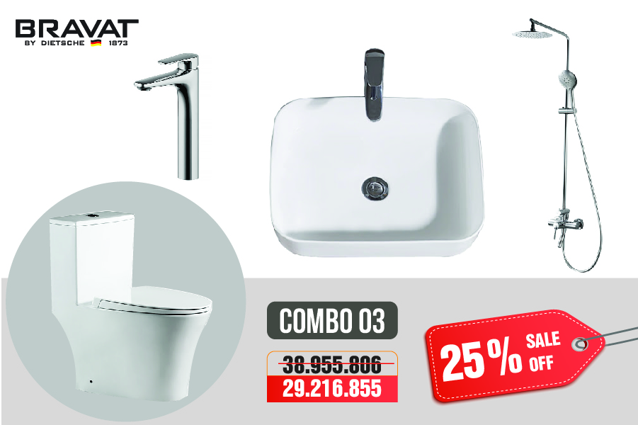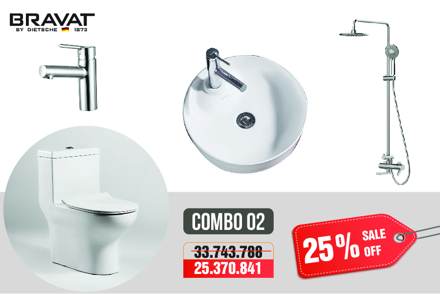 Sở hữu combo thiết bị vệ sinh phòng tắm Bravat chỉ với 18 triệu động không còn là mơ ước xa vời. Trong thời gian này, chúng tôi mở chiến dịch khuyến mại tri ân khách hàng, với chính sách chiết khấu lên đến 25% tổng giá trị đơn hàng. Bạn có thể sở hữu ngay trọn bộ combo phòng tắm cho gia đình mình, biến không gian phòng tắm của mình như khách sạn 5 sao vậy.