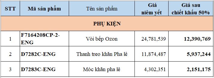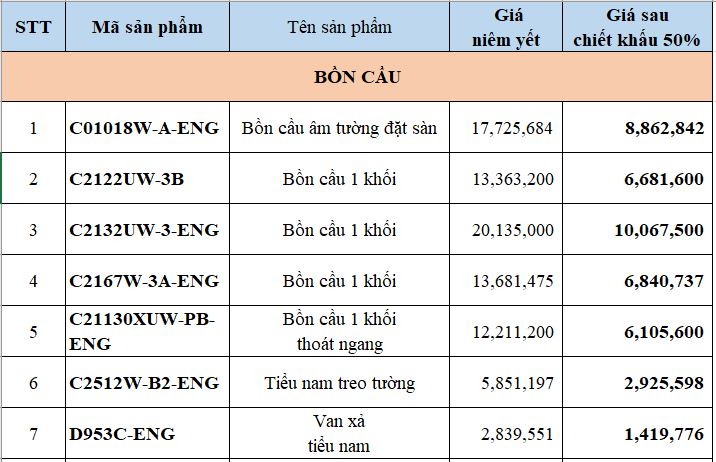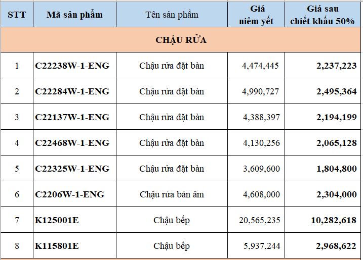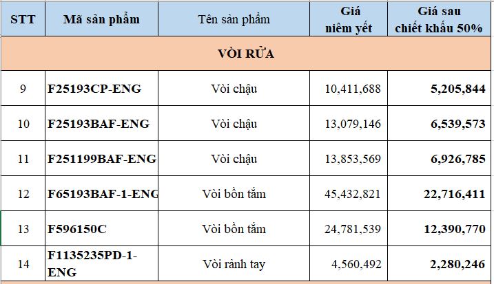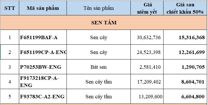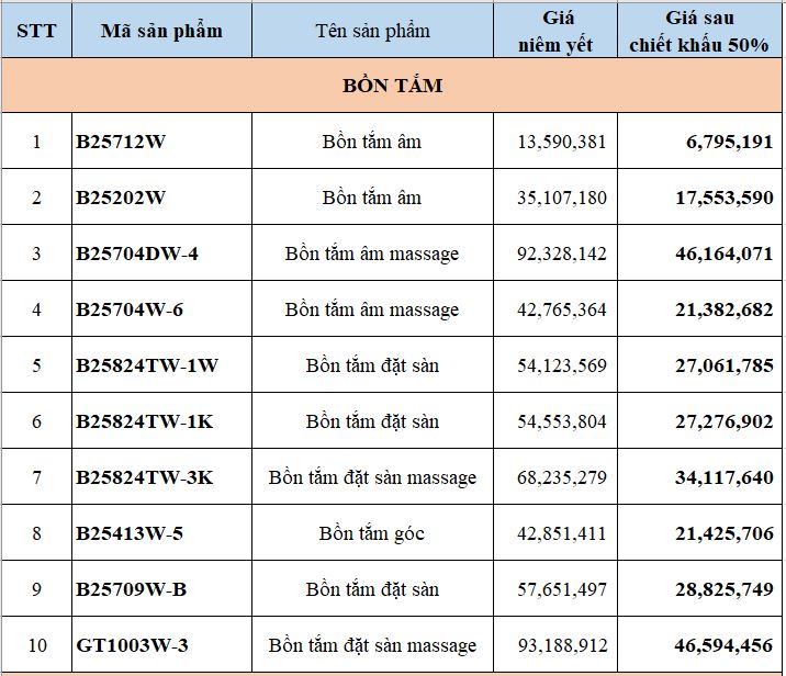 Trong chương trình lần này, Bravat miền Bắc ưu đãi đặc biệt lên tới 50% cho một số sản phẩm có thiết kế độc đáo, ấn tượng. Các sản phẩm trong danh mục chiết khấu 50% bao gồm 39 sản phẩm trong các bộ sưu tập khác nhau như chậu rửa, bồn cầu, bồn tắm, sen tắm, phụ kiện, … Chi tiết tại bảng dưới đây: