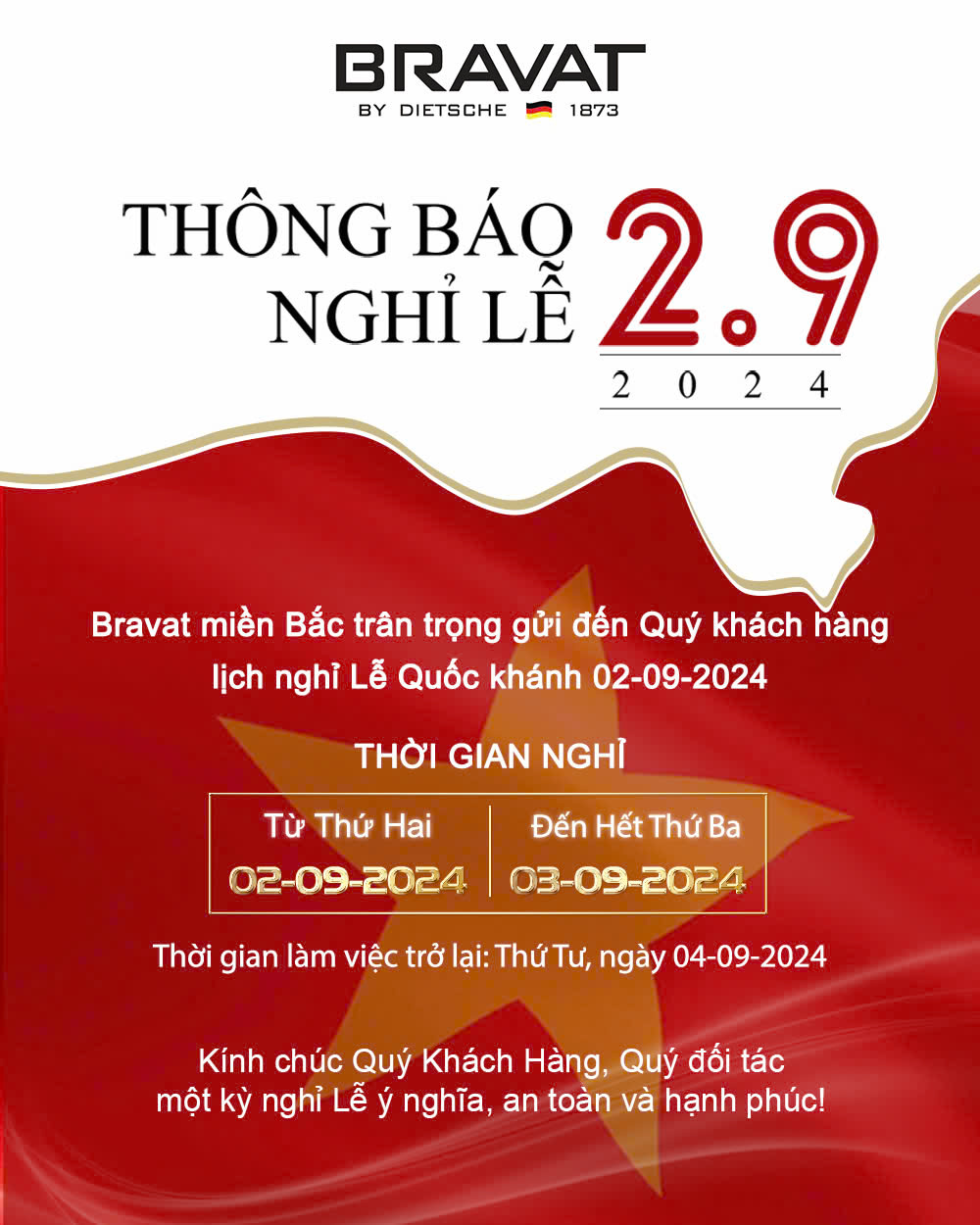 Công ty CP Thương mại Bravat miền Bắc xin chính thức thông báo Lịch nghỉ Lễ Quốc khánh 2/9 như sau – Thời gian nghỉ: Từ thứ Hai ngày...